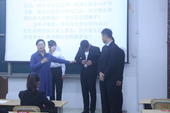 首先,杨老师给我们阐述了开展礼仪教育的重要性。对一个人来说,礼仪是一个人的思想道德水平、文化修养、交际能力的外在表现。而在工作上,;礼仪又代表了一个人的素质涵养和个人风度。接着,杨老师就为我们示范在不同场合所需要的不同的礼仪姿态。首先是示范的是礼仪姿势。主要有鼓掌姿势、站姿、坐姿、走路姿势、谈话姿势以及握手。杨老师多次与同学们展开互动,以加深同学们对授课内容的理解,带动同学们的积极性。课程中陈老师还当场与多名同学进行握手以便更好的向同学们展示握手的准确规范。大家在老师的示范中和自己的亲身体验中学习到许多礼仪知识。接着,杨老师又谈到餐桌礼仪,杨老师都为我们一-做了示范。