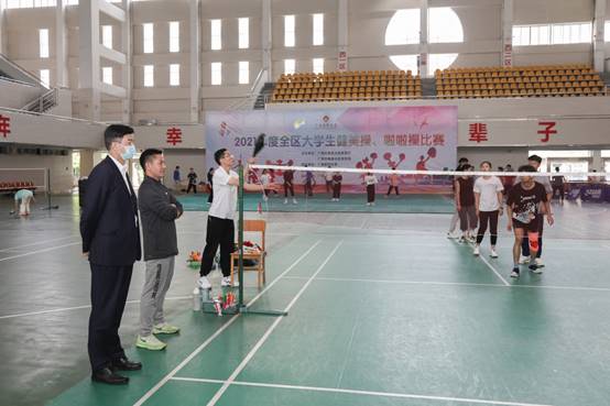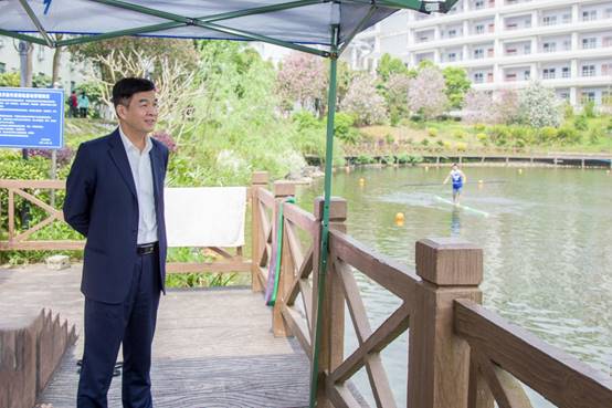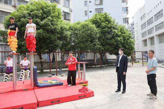 韦安光一行先到体育馆看望排球男女队、毽球队、武术队、舞龙舞狮队、健美操队的训练情况,随后到金盆捞月看望独竹漂的训练。