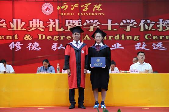 在学士学位授予仪式中,同学们依次上台,蓝建卓经理着导师服为毕业生颁发学位证书并拨穗,祝同学们顺利毕业。