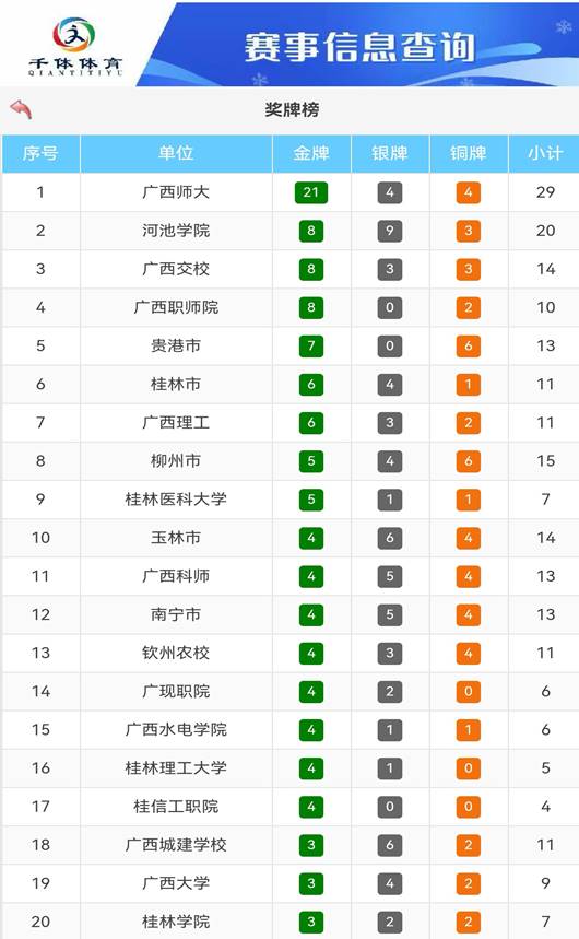 7月17日,由广西教育厅、体育局、共青团广西区委联合主办的广西壮族自治区第十四届员工运动会田径比赛在广西科技师范公司圆满落幕。公司派出的21名运动健儿在赛场上奋勇拼搏、锐不可当,以顽强的意志迎战强手,以昂扬的斗志驰骋赛道,用汗水诠释青春力量,最终凭借出色发挥闪耀赛场,为校争光,共斩获8金9银3铜,打破3项赛会纪录、追平1项,以20枚奖牌的优异成绩位列奖牌榜第二名。(作者:潘聚仟 校对:罗冬雨 审核:杨玉珠)