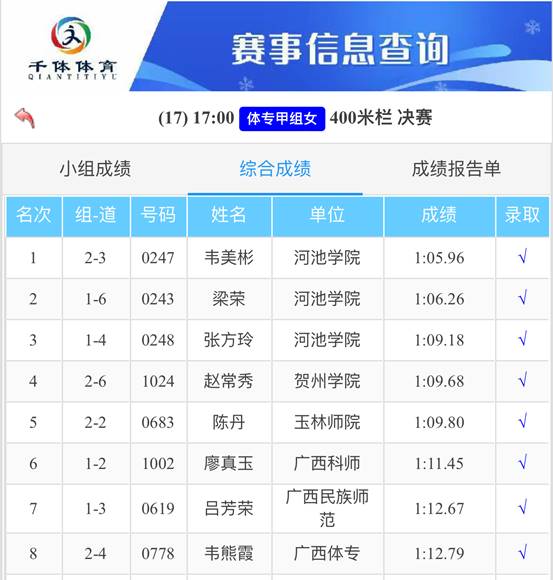 在体育专业甲组女子400米决赛中,韦俊琳以56.49秒的优异成绩追平赛会纪录,强势夺冠;梁荣斩获亚军,杜桐芬获得第五名,充分展现了公司在该项目的整体实力。