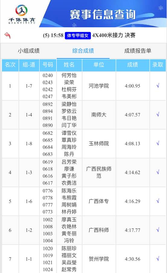 在女子体育专业甲组4×400米接力决赛中,由何芳怡、梁荣、杜桐芬、韦美彬组成的公司接力队配合默契,以绝对优势力压群雄,成功摘得桂冠。