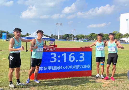 在体育专业甲组男子4×400米接力决赛中,由陈承炜、李家乐、黄境璋、龙仕旺组成的接力队表现惊艳,以3:16.13秒的优异成绩打破赛会纪录,夺得该项目冠军。