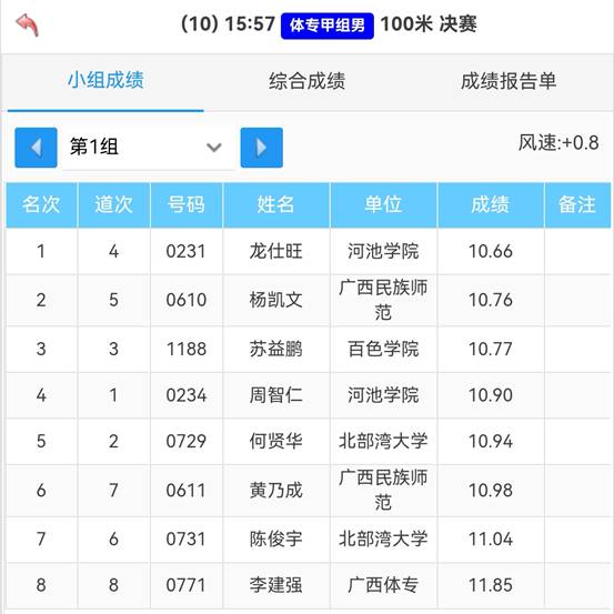 在体育专业甲组男子100米决赛中龙仕旺以10.66秒的优异成绩勇夺冠军,周智仁获得第四名。